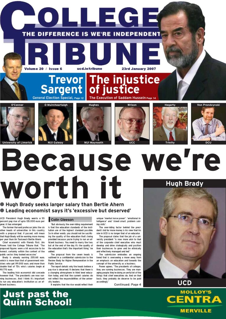 Surprisingly, the College Tribune was set up with not just the consent of UCD, but the encouragement of it’s executive. Former UCD President Art Cosgrove was president at the first editorial meeting, along with other student journalists and Browne.