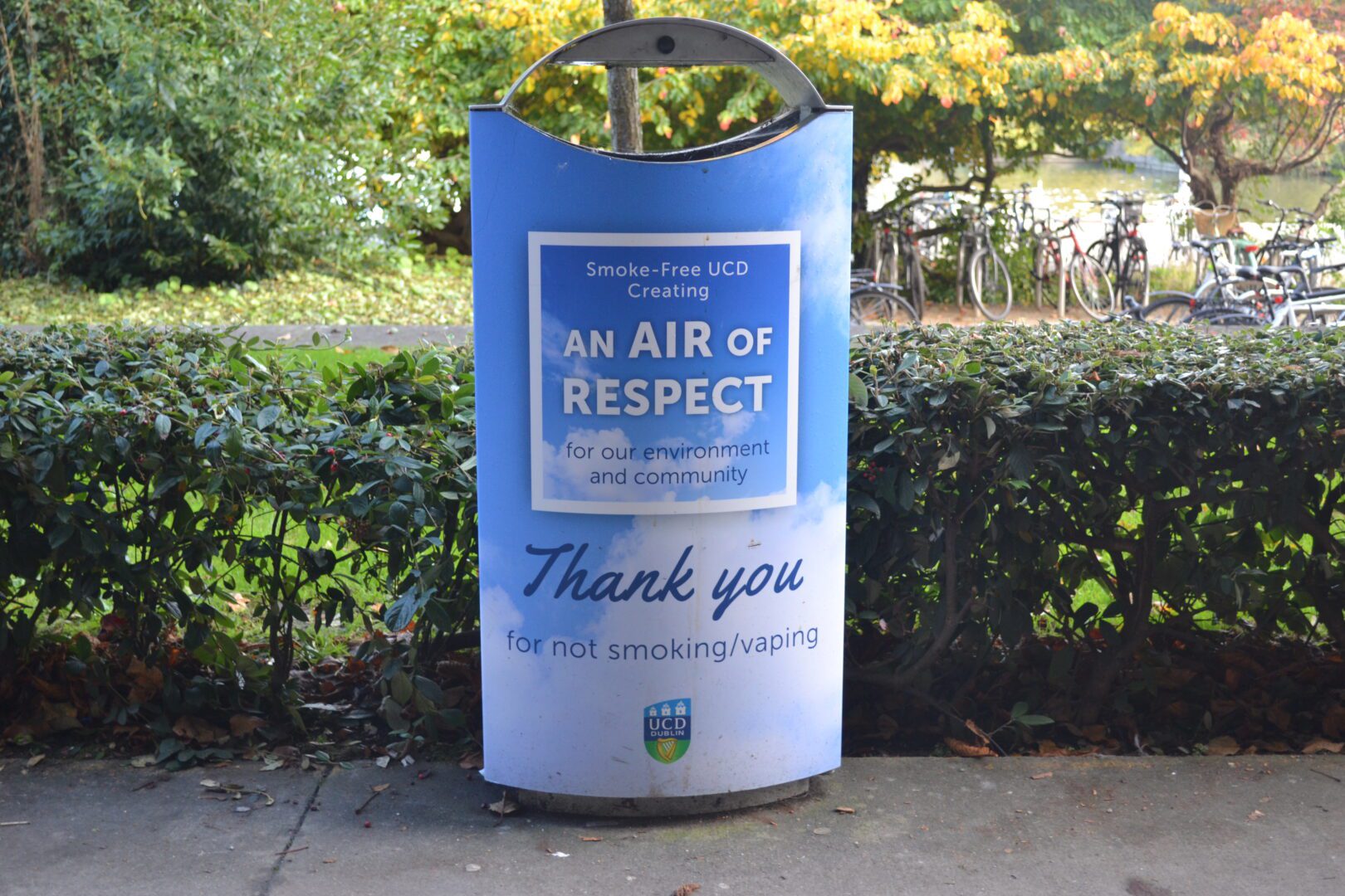 The Policy states that ‘defined areas of its campuses are smoke-free and that smoking and vaping/e-smoking in all forms is prohibited in these areas.’ Phase One was implemented in September 2015. Smoke-free zones within 10 metres of all building entrances and in prescribed areas, which included the UCD James Joyce Library colonnades, the front of the O’Brien Centre for Science, the front of Newman building, the front of UCD Sutherland School for Law, and the front of UCD Lochlann Quinn School of Business.