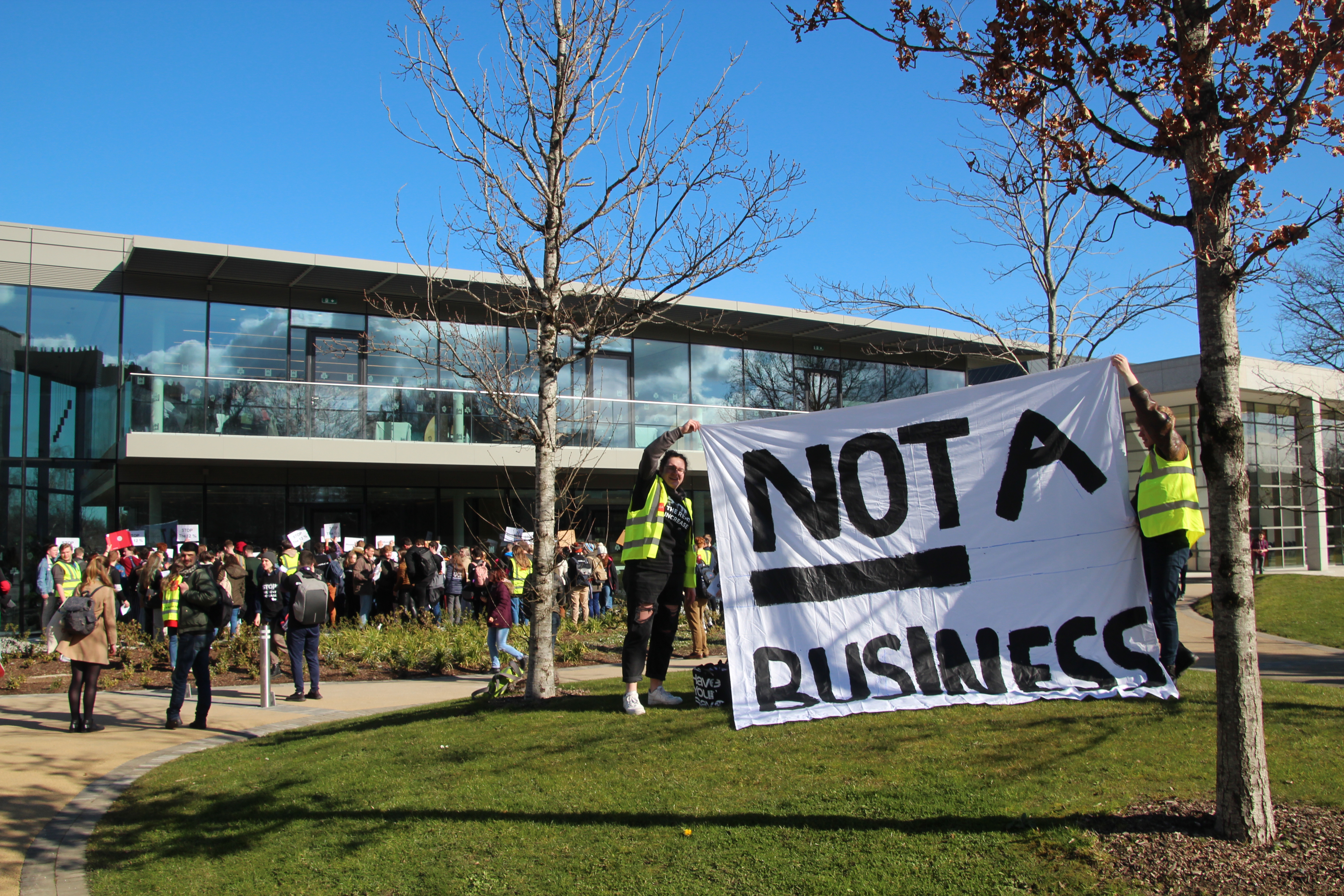 In cooperation with Fix Our Education UCD, the UCD Students’ Union organised a demonstration of staff and students outside the University Club today, March 4th. The protest aimed to oppose the planned 12% increase of on-campus rental accommodation and the commercialisation of the publicly funded university.
