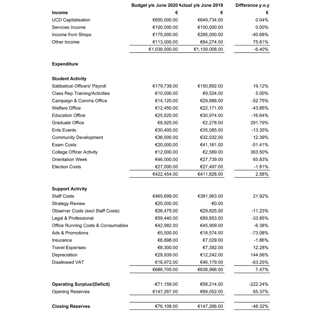 The College Tribune has obtained the UCD Students’ Union Financial accounts for the Year 2018/19. The organisation’s 2019/20 budget is also included in the document released by the Union. We’ve put together the most notable figures from these documents and compared them with the 2018/19 budget.